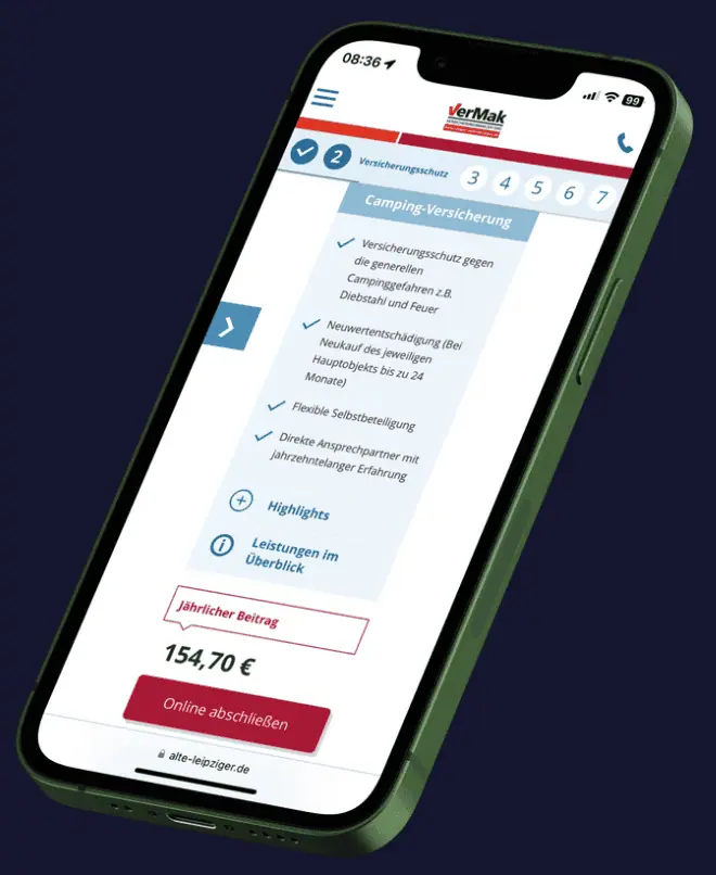Sie werden zur Berechnung Ihrer VerMak Campingversicherung für Dauercamper auf eine Plattform des Risikoträgers ALTE LEIPZIGER Vers. AG weitergeleitet. Ihre Antragsdaten werden erst nach verbindlicher Antragsbestätigung zur Versicherungsschein-Erstellung gespeichert.